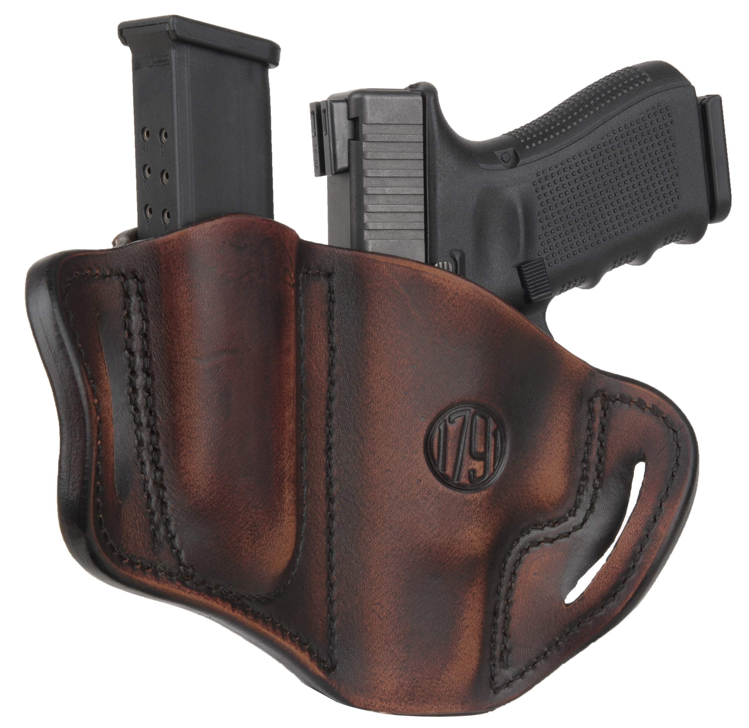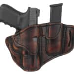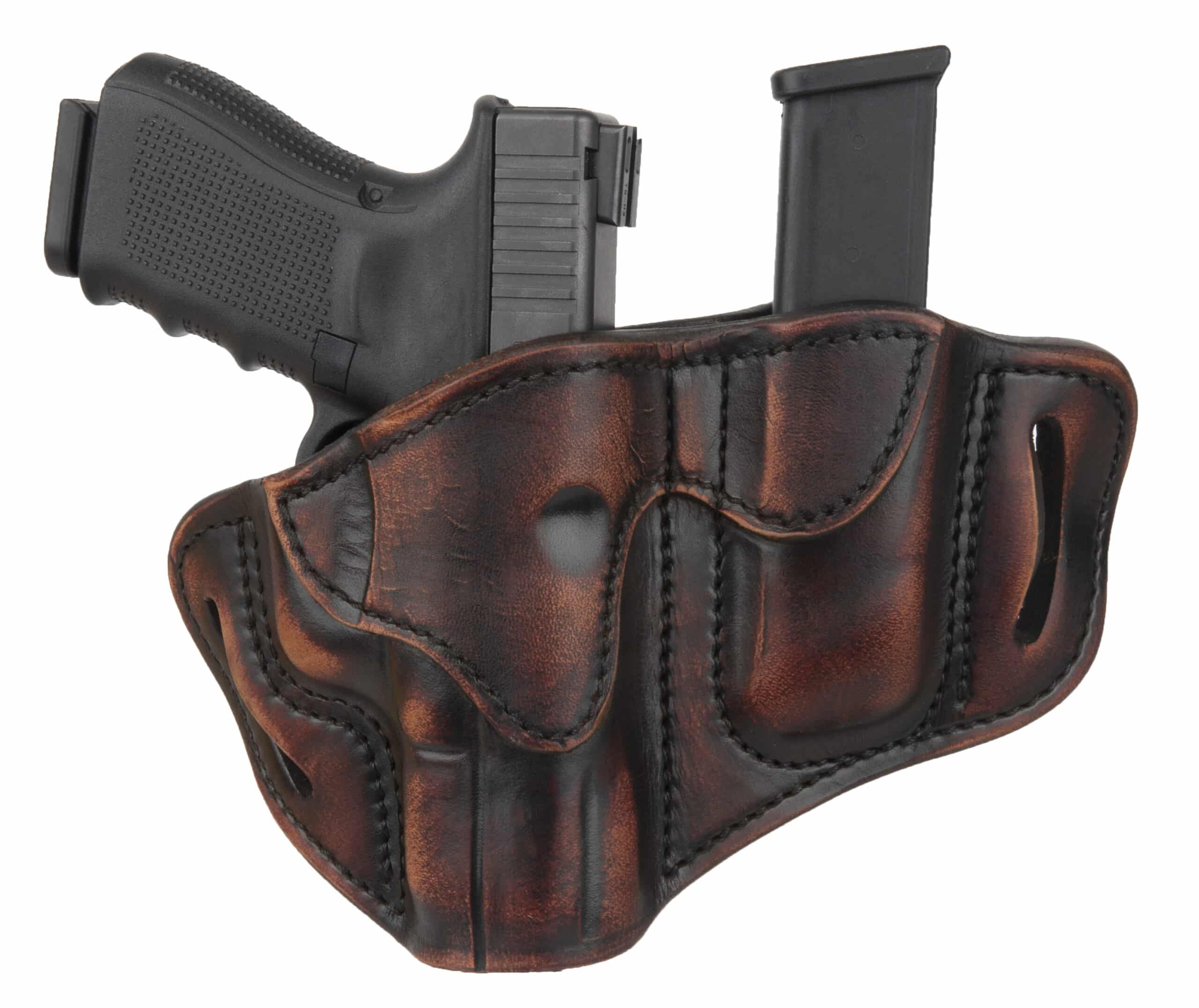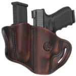 The Combo Open Top Multi-Fit Belt Holster and Mag Pouch is a pancake-style holster that holds your gun and ammo tight using natural pressure between double-stitched leather and a weeks-long, wet-molding process. The premium heavy steer hide leather we use is of the highest quality, made to last by fourth-generation leather artisans. The open top design and curved, wide-spaced belt loops optimized for a 1.5” belt allow a closer ride and more comfortable carry.
