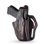 The BHX delivers incredible retention and superior leather and build quality. It also includes 3 belt loops that allow you to carry two distinct positions. The FBI-Cant allows for a quick reaction draw of your weapon and the Back-Cant is intended for quicker pickup of your target, especially useful when sitting or driving. The BHX is a high-end leather design that is molded and contoured for your pistol and accommodates taller Suppressor Sights, yet is comfortable against the body due to the handcrafted premium 100% Certified American, Heavy Native Steerhide leather. This holster’s interior is hand-finished to help protect the bluing of your pistol and includes design enhancements like a reliable Thumb Break, multi-cant positioning options on the belt, double stitching for reinforced life-time enjoyment, and more barrel room for higher front-sights.