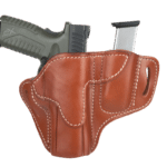 The Combo Open Top Multi-Fit Belt Holster and Mag Pouch is a pancake-style holster that holds your gun and ammo tight using natural pressure between double-stitched leather and a weeks-long, wet-molding process. The premium heavy steer hide leather we use is of the highest quality, made to last by fourth-generation leather artisans. The open top design and curved, wide-spaced belt loops optimized for a 1.5” belt allow a closer ride and more comfortable carry.