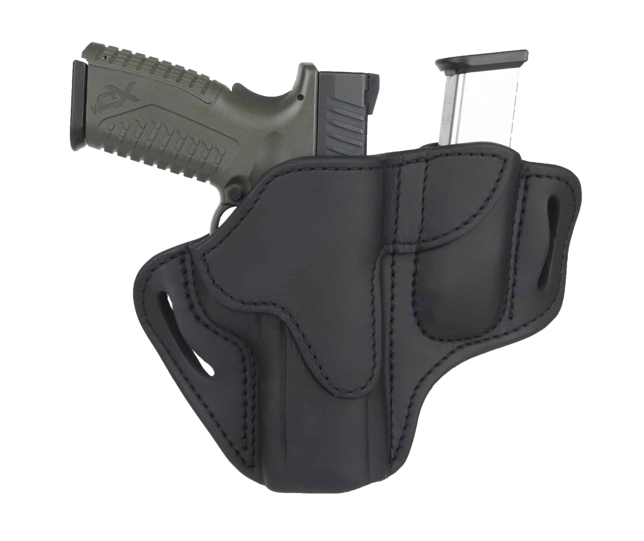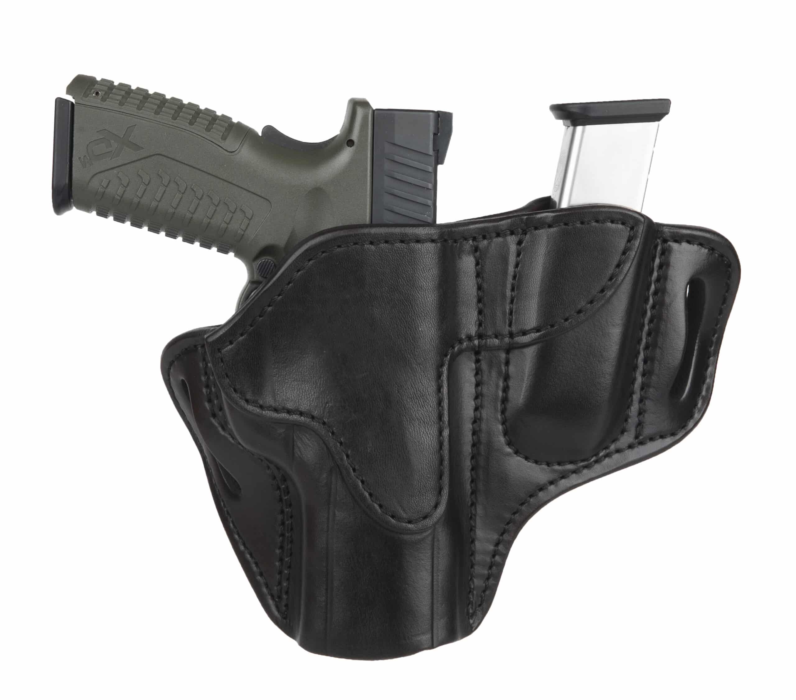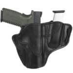 The Combo Open Top Multi-Fit Belt Holster 2.4 and Mag 1.2 is designed for use on duty, on the range, or in the field, with extra carrying capacity and all-day comfort in mind. Designed to be used with double-stack magazines. As with our other open top holsters, you’ll get a quicker, more confident draw without unnecessary security features in your way.