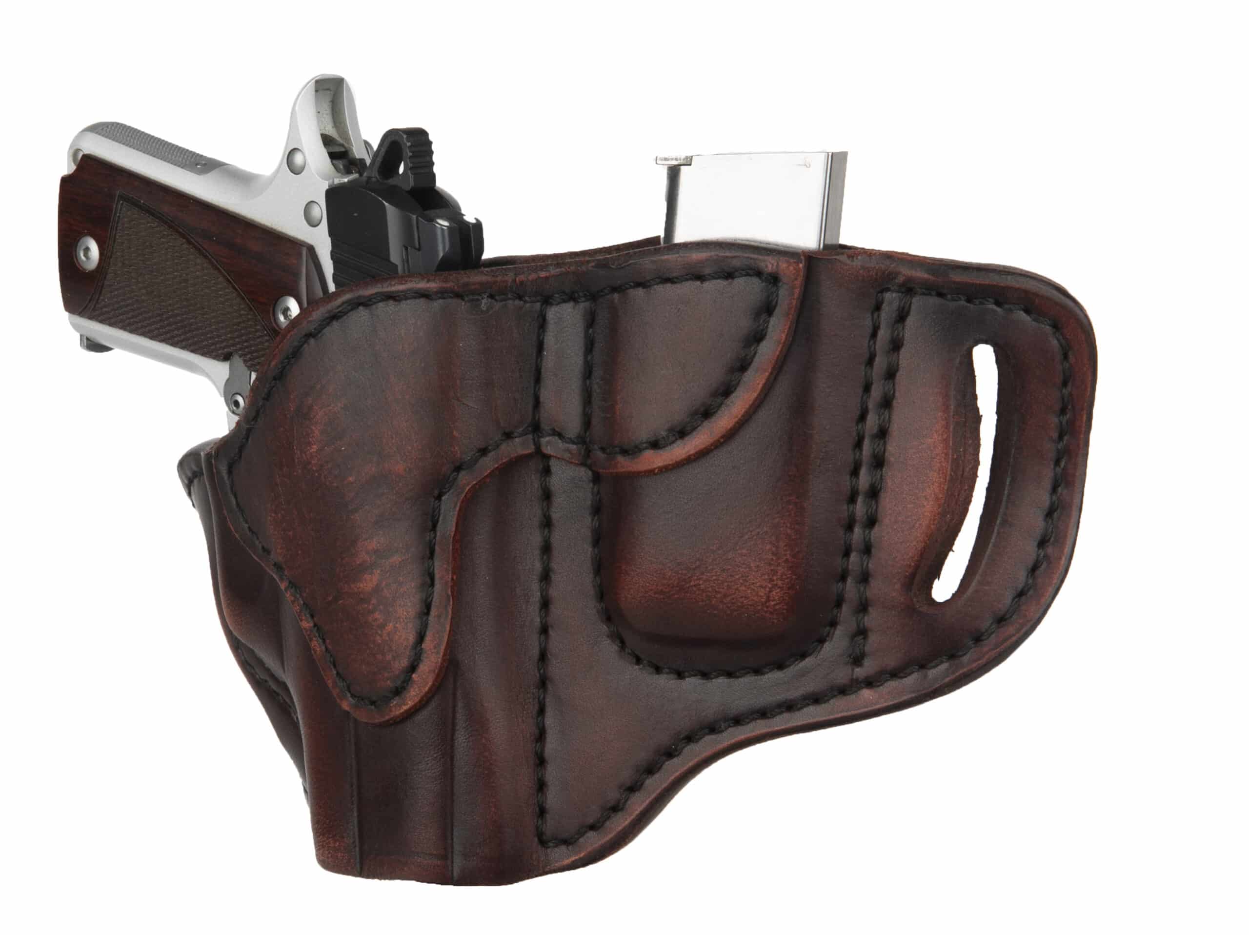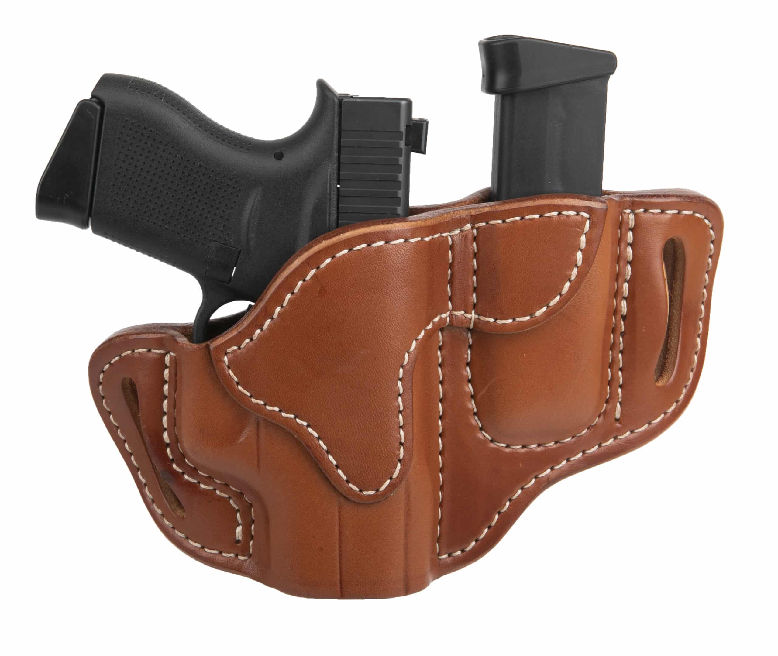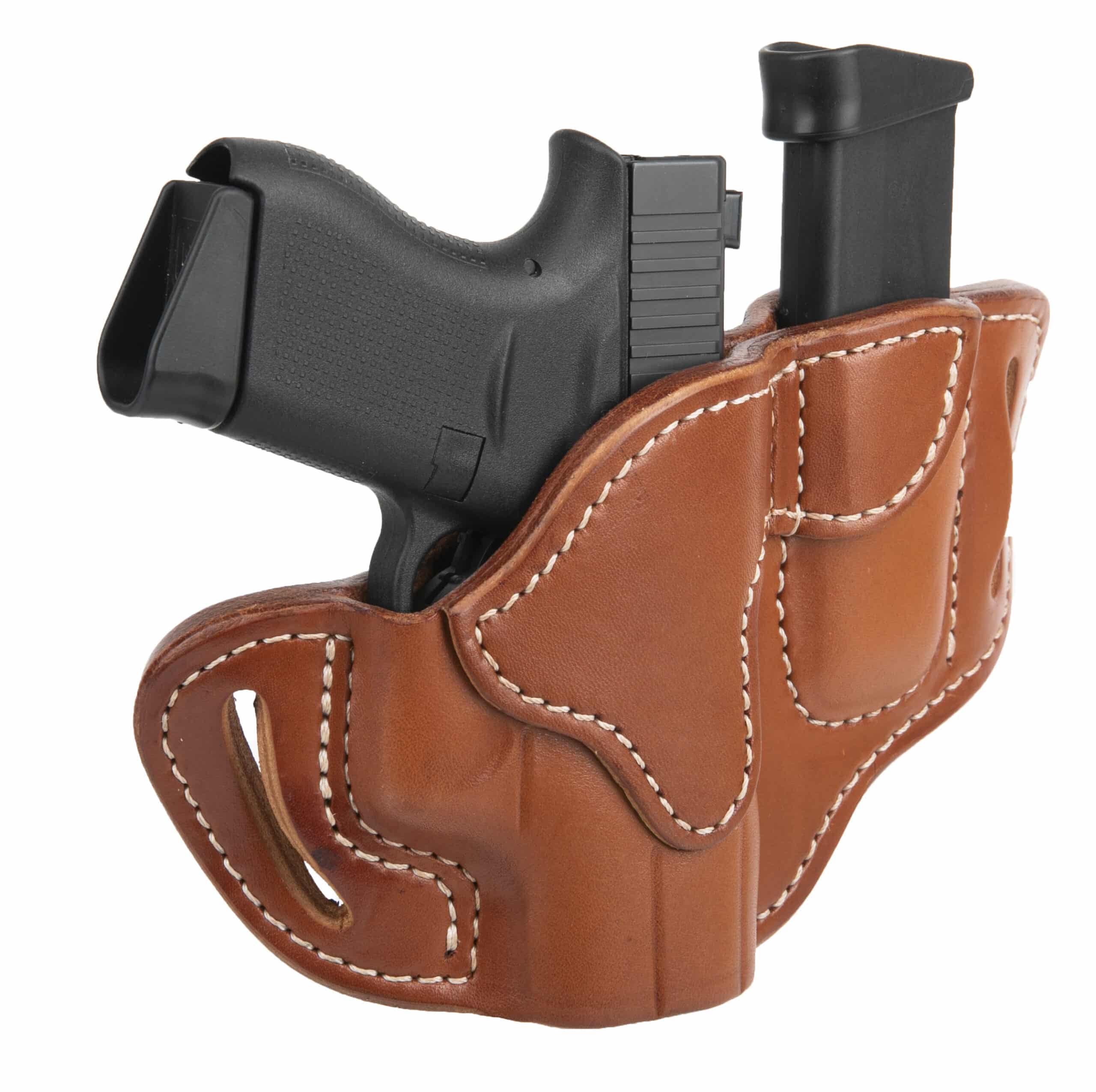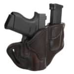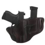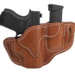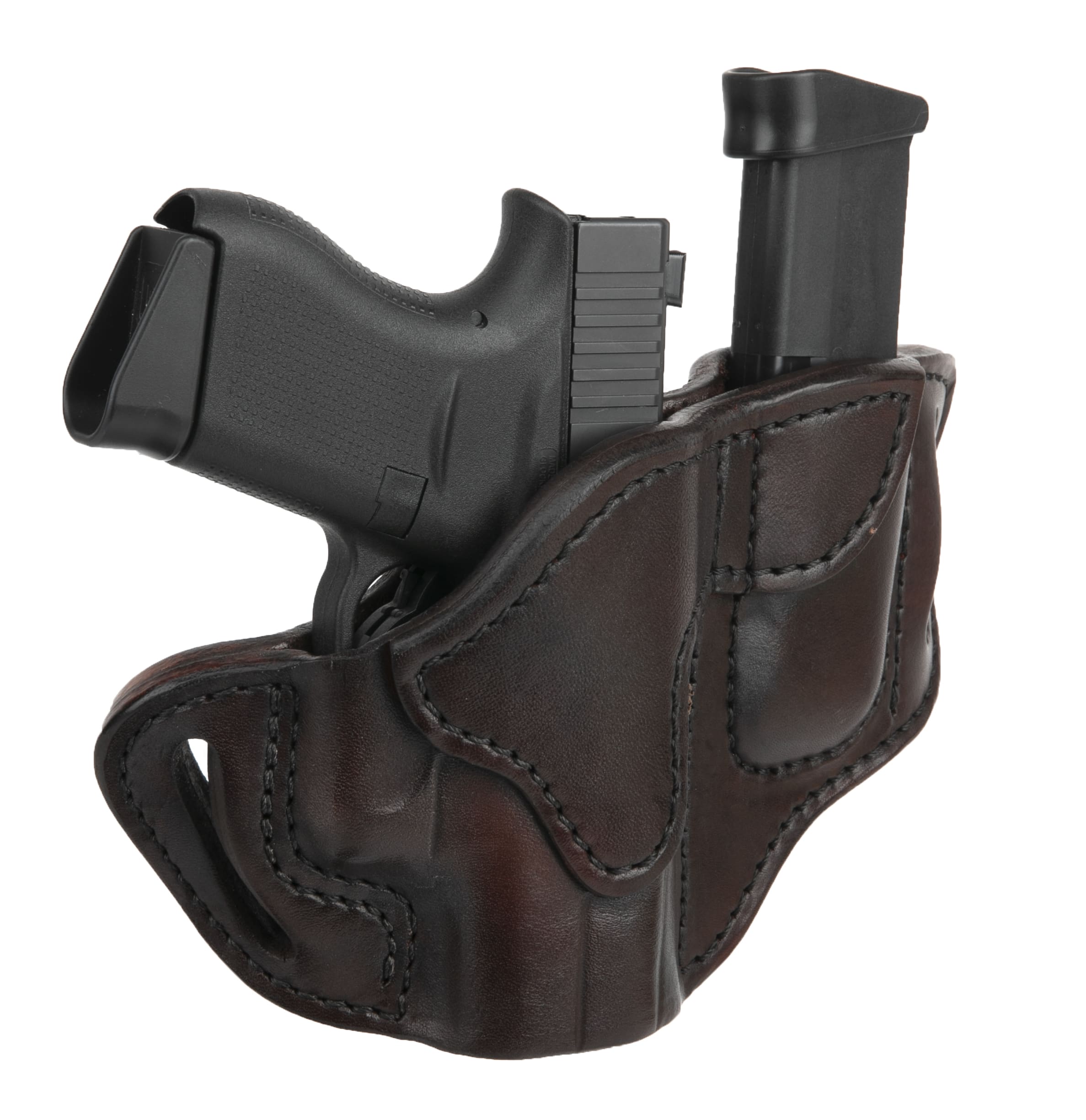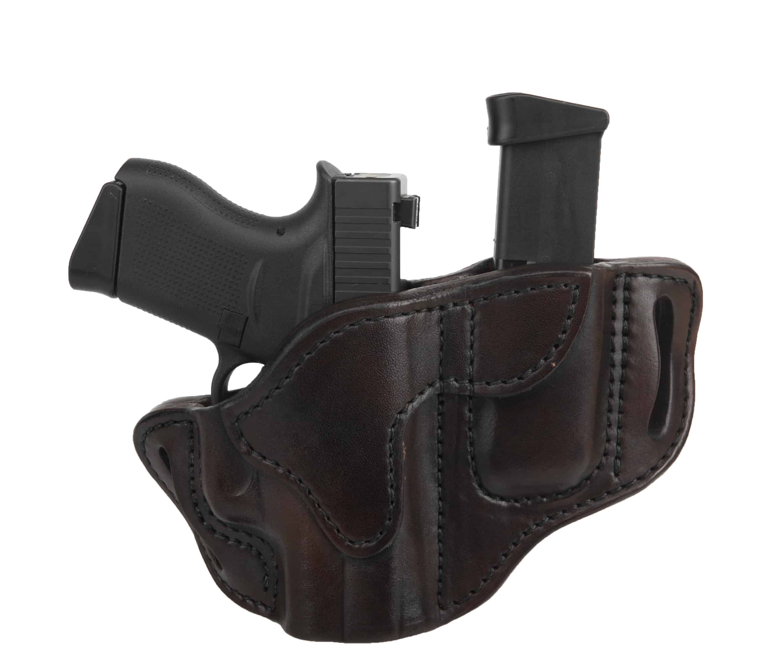 The Combo Open Top Multi-Fit Belt Holster and Mag Pouch is a pancake-style holster that holds your gun and ammo tight using natural pressure between double-stitched leather and a weeks-long, wet-molding process. The premium heavy steer hide leather we use is of the highest quality, made to last by fourth-generation leather artisans. The open top design and curved, wide-spaced belt loops optimized for a 1.5” belt allow a closer ride and more comfortable carry.