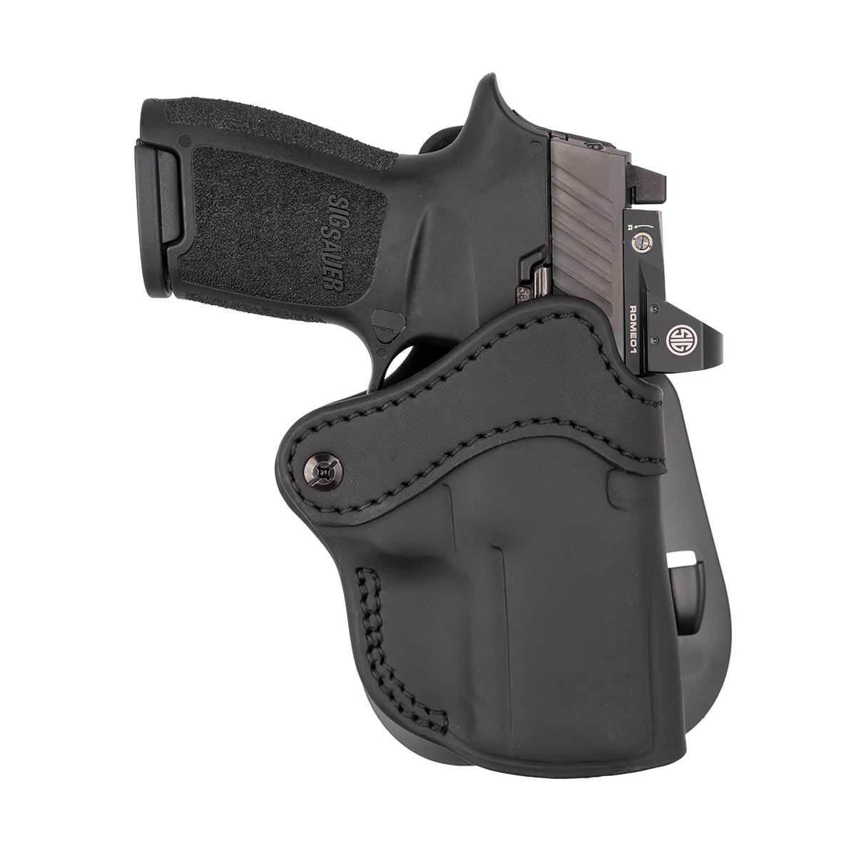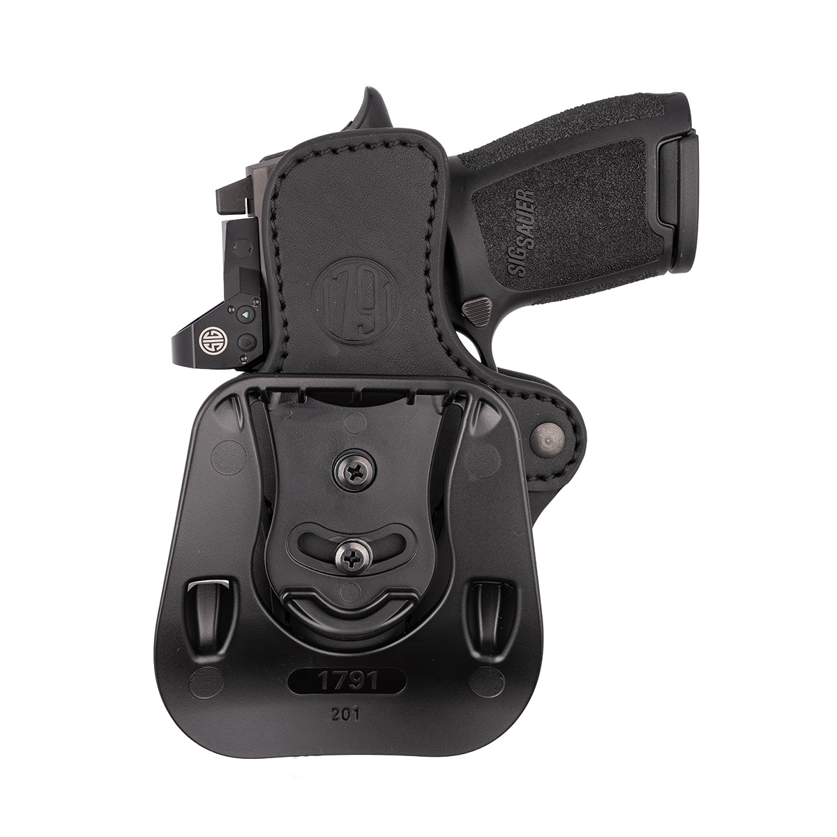 Our Optic Ready Paddle BH2.4s holster is best suited for Full Size Compact Firearms with barrels in the 3.5 to 4 inch range. Includes an added Optic Cut to accommodate most pistol optics. Additionally, the sweat guard will protect your gun from tarnishing and will act as a comfortable barrier between you and your hammer preventing any gouging into your side. The BH2.4s comes in a variety of colors to match your gun and attire. The paddle is adjustable and allows for quick on and off while ensuring proper retention.