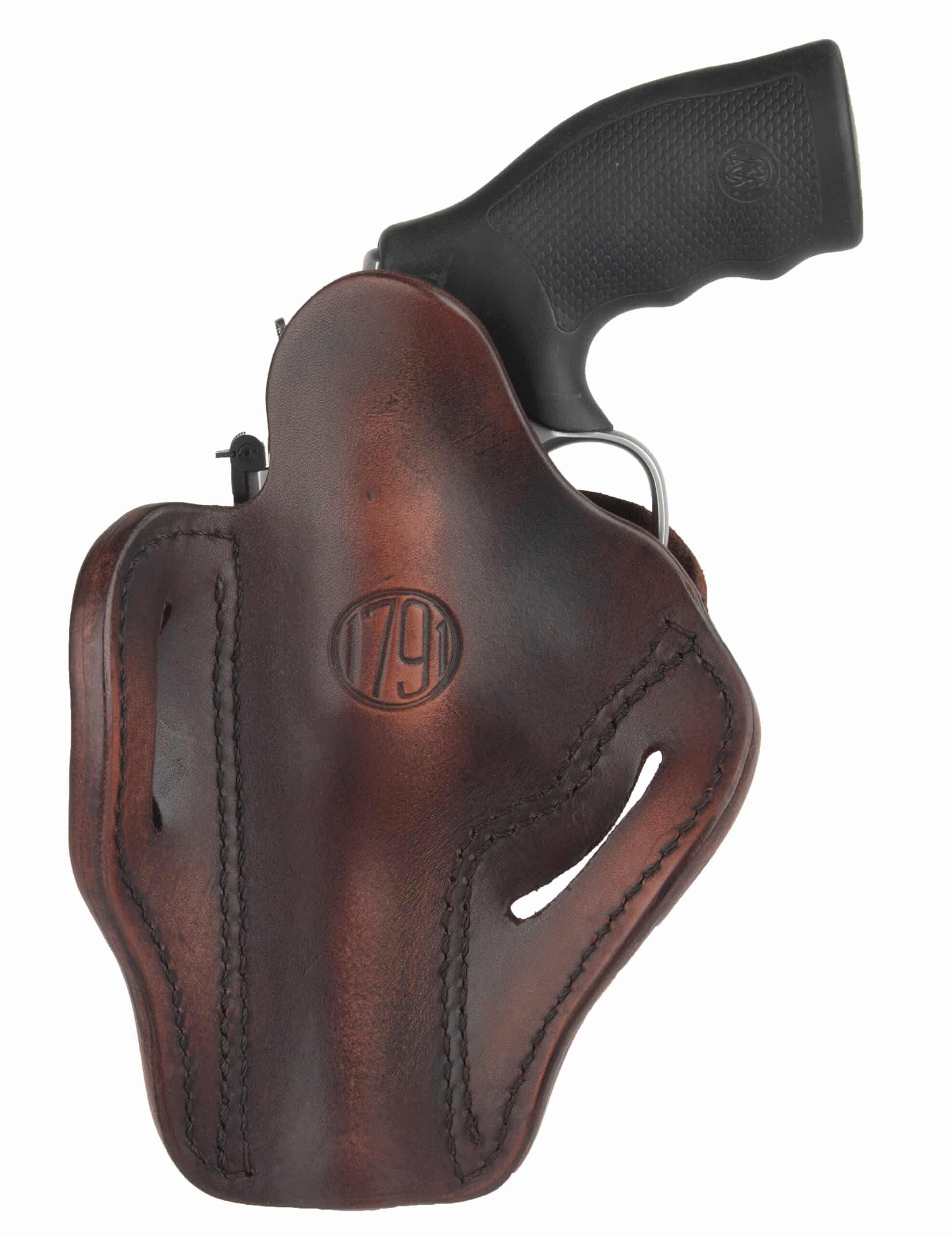 While there are many different brands offering k-frame revolver holsters, 1791 Gunleather products are among the very best. You can get a cheap piece of black nylon to hold your prized firearm, but why not treat yourself to a great-looking, great-smelling, comfortable leather holster that for proud upholding of Second Amendment rights? All our products are made from the highest quality American materials by fourth-generation leather artisans, with attention to detail without going overboard on frivolous embellishments. The convenient multi-fit design is able to accommodate a wide range of k-frame firearms, no matter the barrel size or manufacturer. We are happy to address any specific questions you have about our leather holsters before you buy.