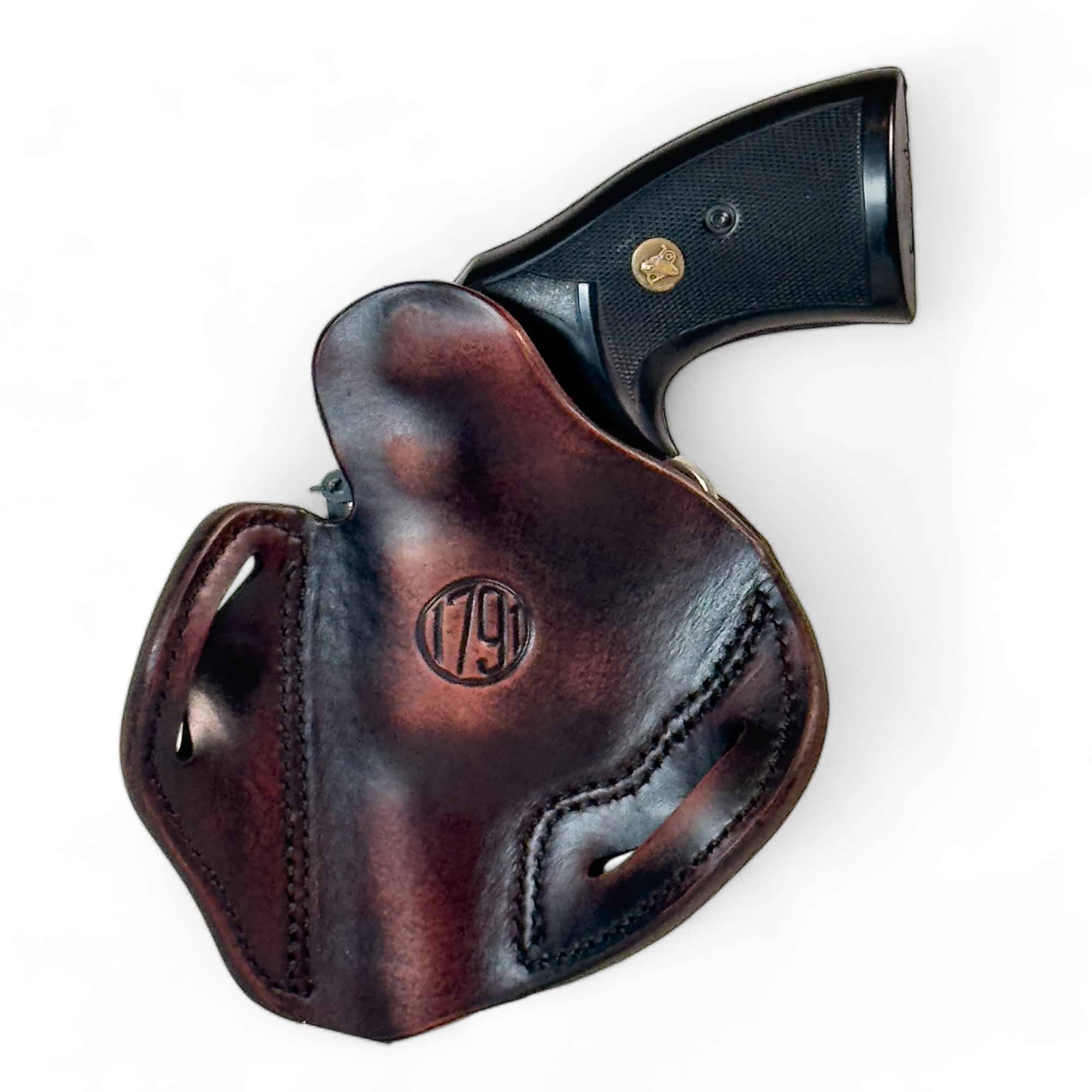 The 1791 Gunleather Revolver Belt Holster 4.3, better known as the RVH4.3, is handcrafted and molded by leather artisans from 100% certified American heavy native steerhide. The RVH4.3 is designed to accommodate L-frame (medium frame) revolvers with barrels up to 3″ and is the perfect match for your Colt Python .357/.38 and Smith & Wesson 686 Plus, among others.