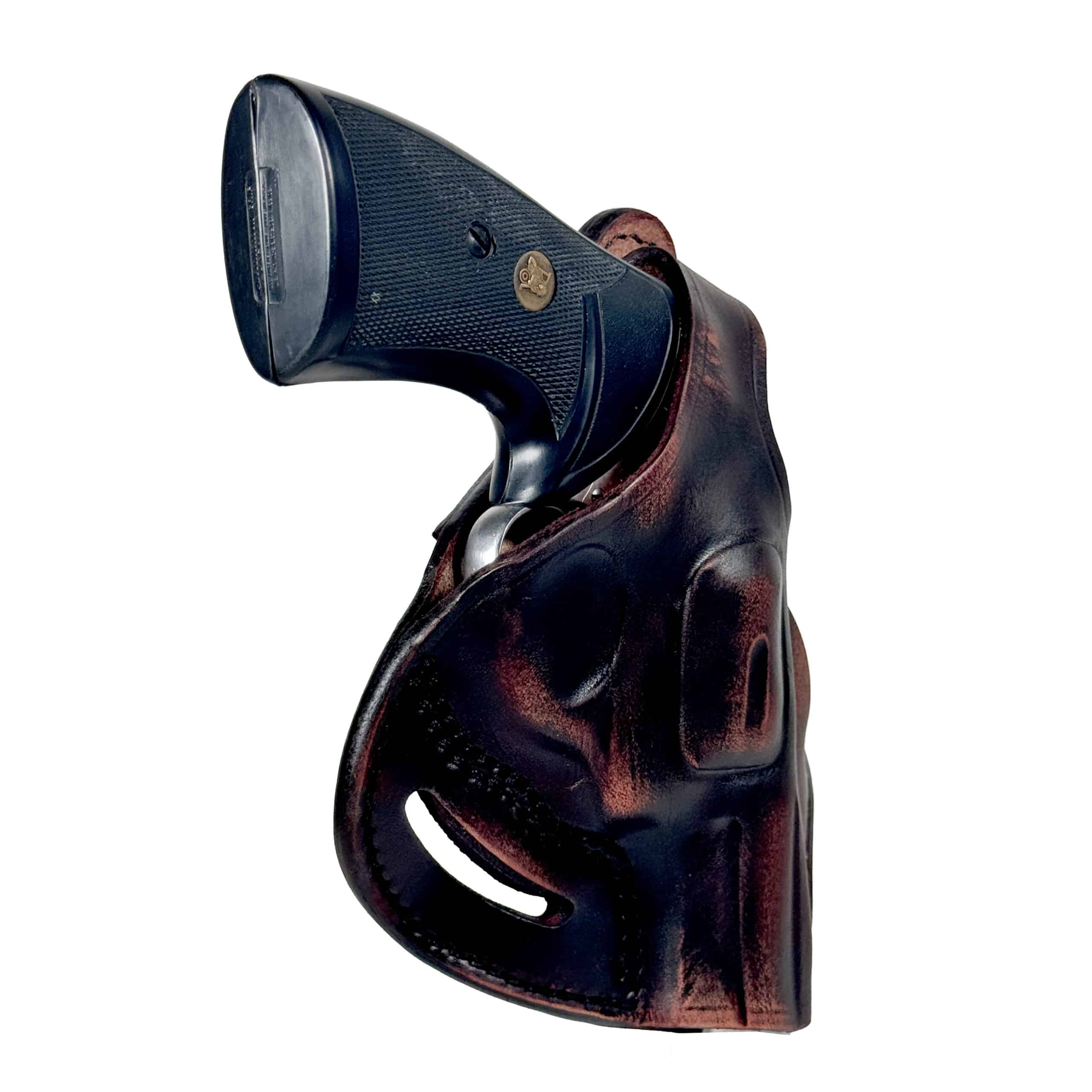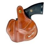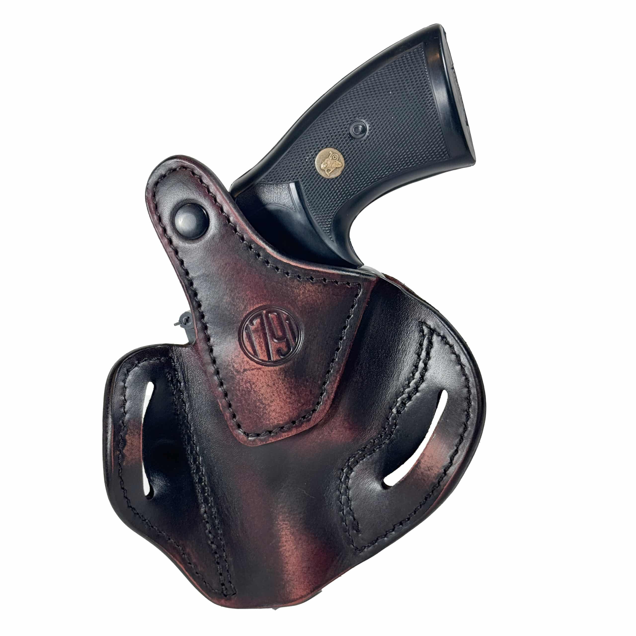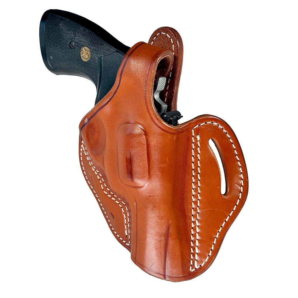 The 1791 Gunleather Revolver Thumb Break Belt Holster Size 4.3, better known as the RVHX-4.3, is handcrafted and molded by leather artisans from 100% certified American heavy native steerhide. The RVHX-4.3 incorporates a thumb break snap closure to optimize security and retention when carrying your revolver. It is designed to accommodate L-frame (medium frame) revolvers with barrels up to 3″ and is the perfect match for your Colt Python .357/.38 or Smith & Wesson 686 Plus, among others.